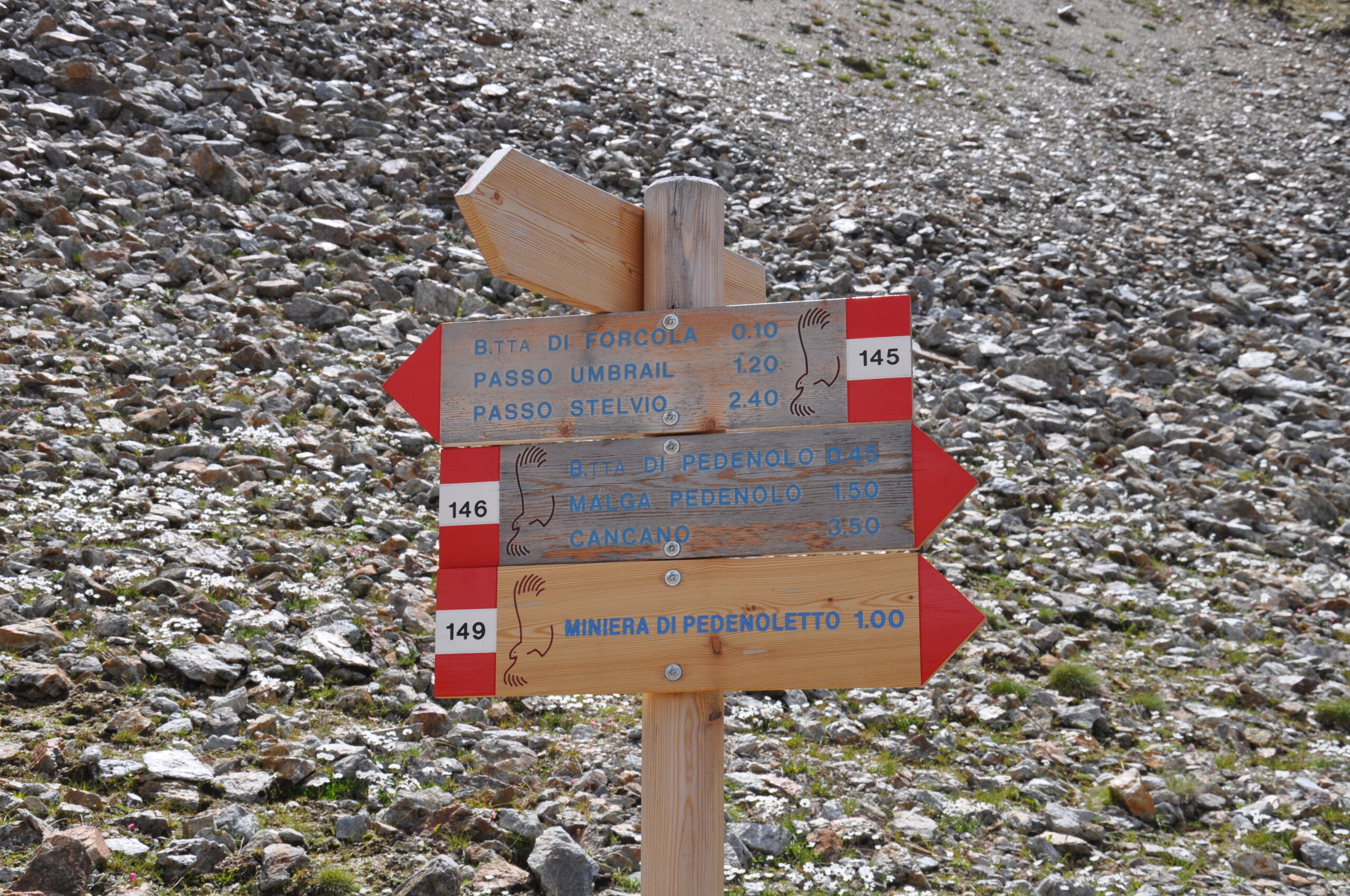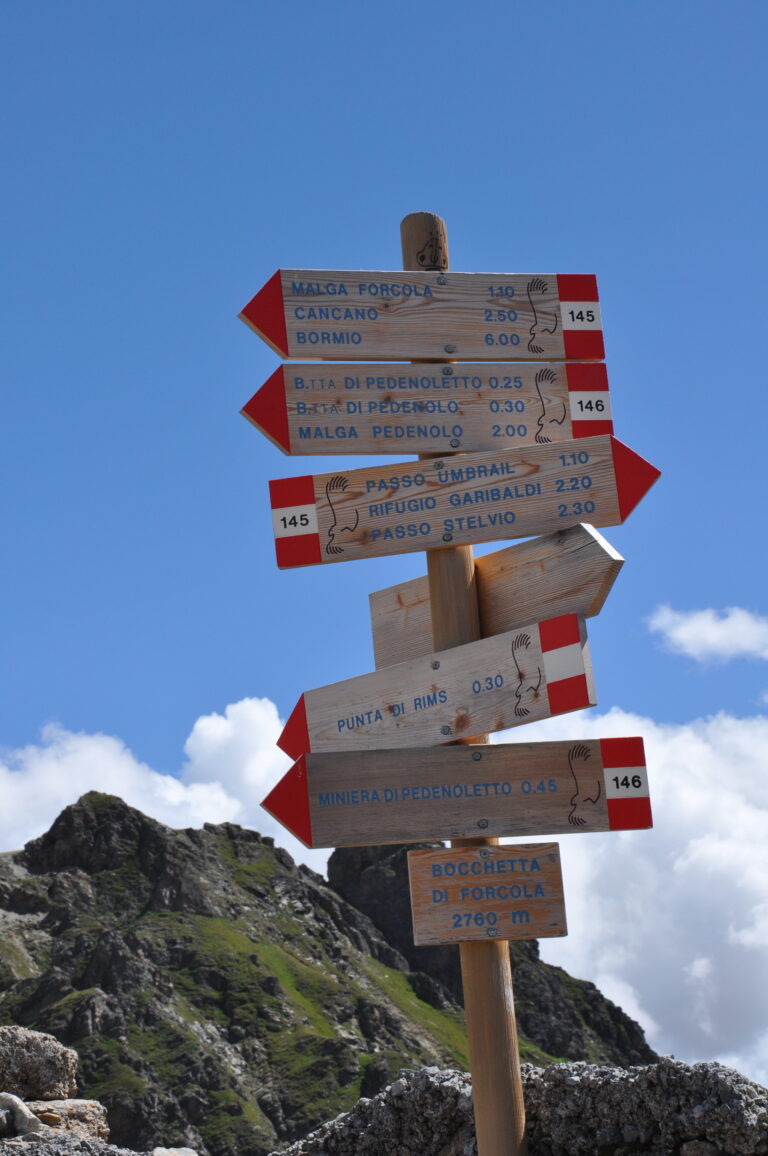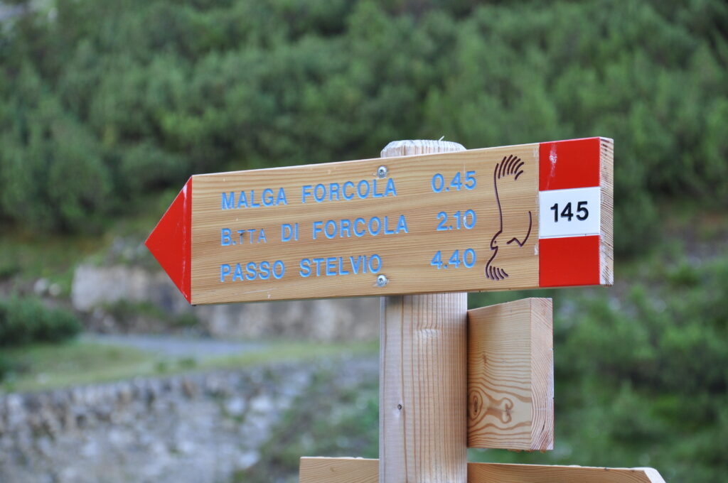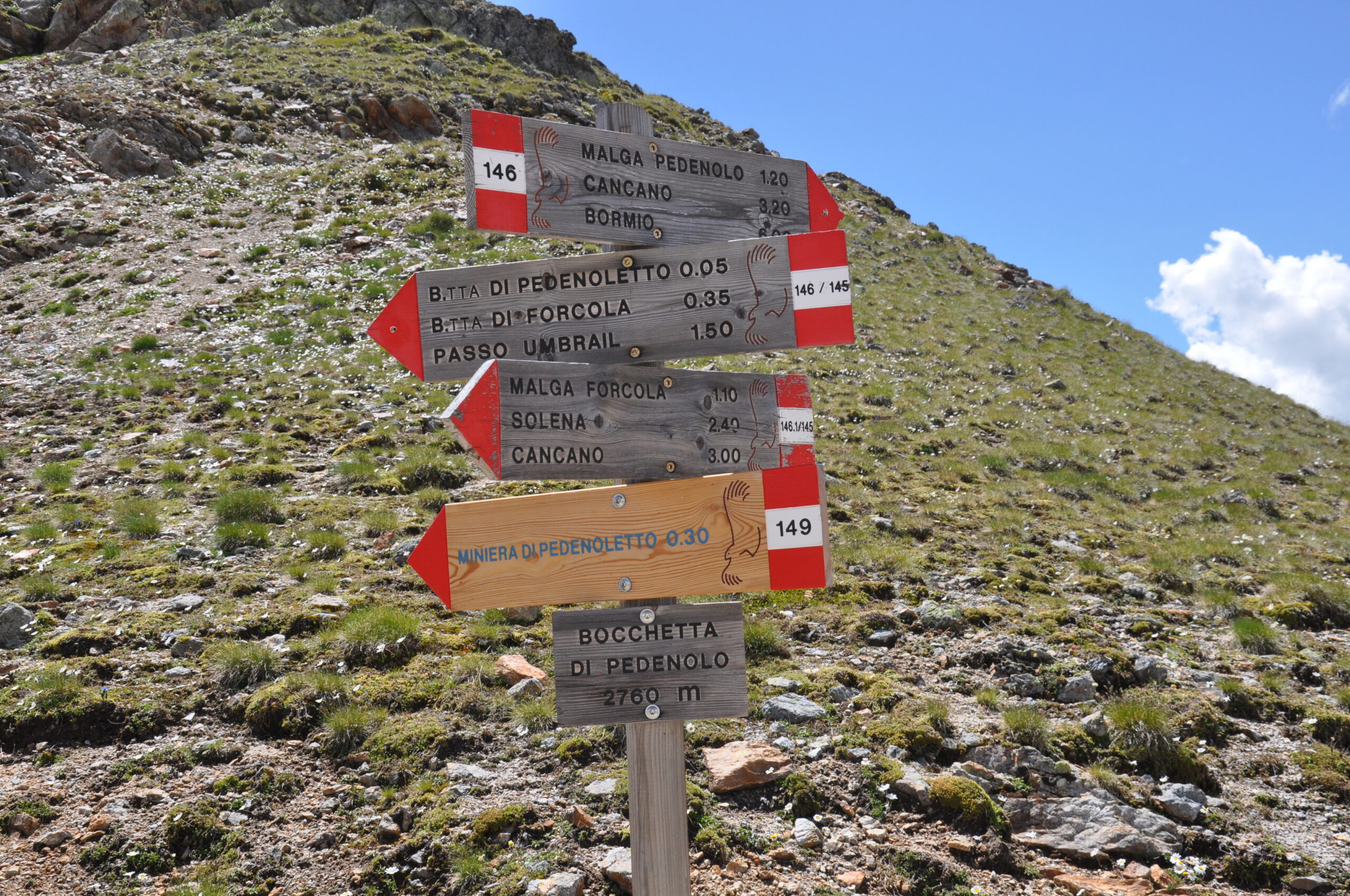 Se non si vuole salire alla Bocchetta di Forcola (comunque vale la pena raggiungerla per la vista sullo Stelvio e Sull’Ortles!), prendere a destra come indicato dal segnale sopra. Continuare invece sulla mulattiera per raggiungere la Bocchetta