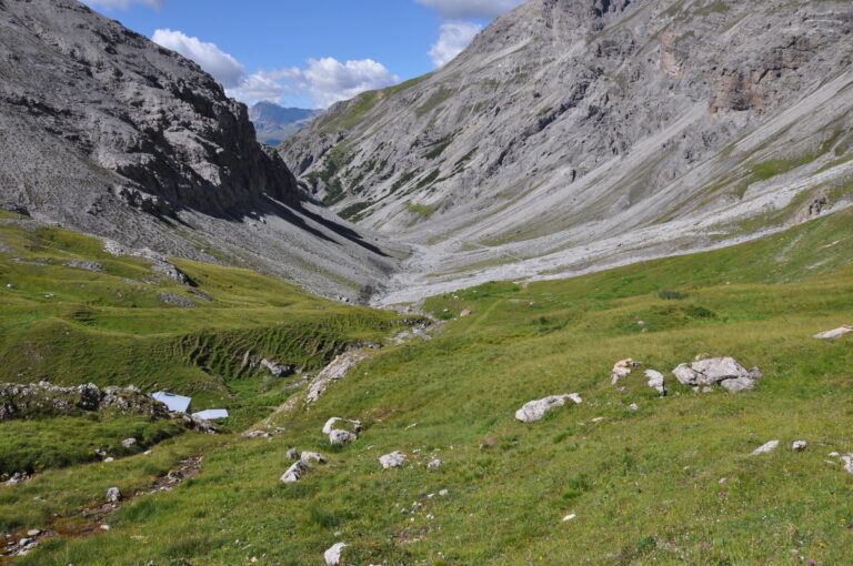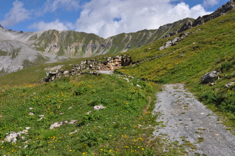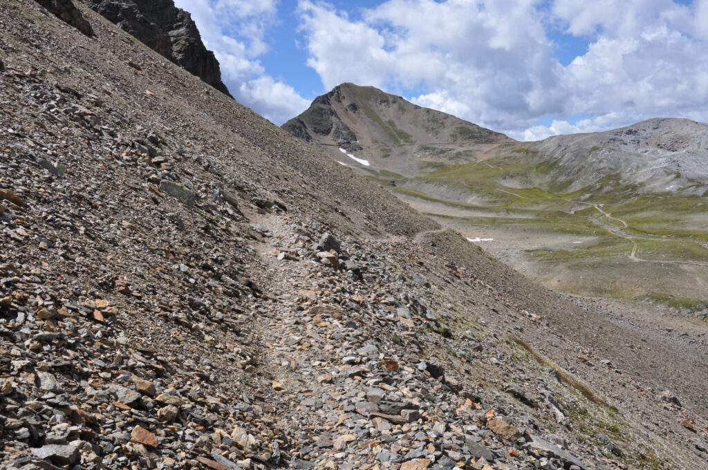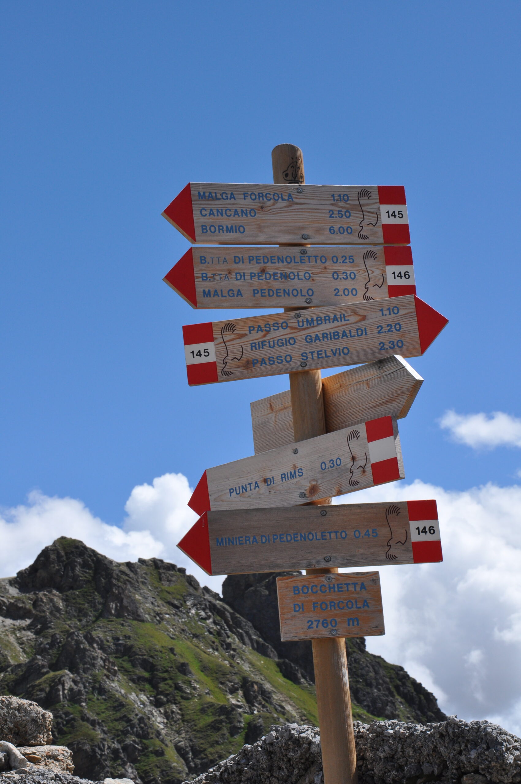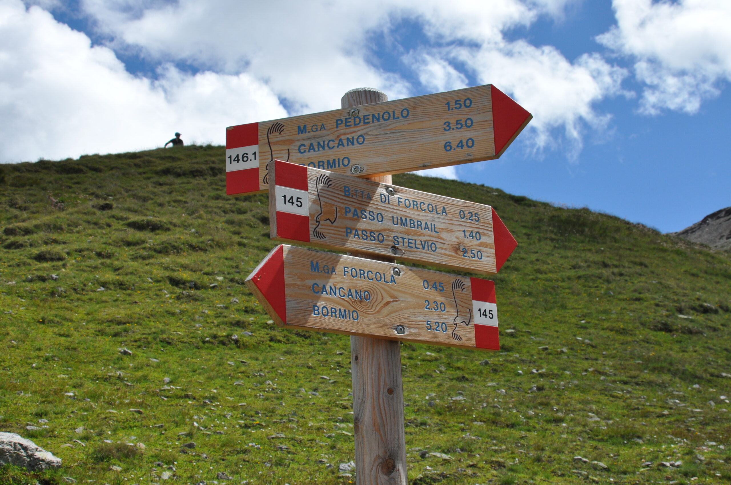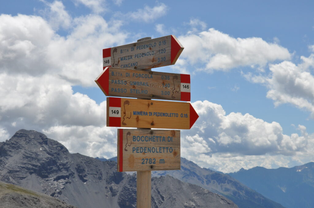 Se non si vuole salire alla Bocchetta di Forcola (comunque vale la pena raggiungerla per la vista sullo Stelvio e Sull’Ortles!), prendere a destra come indicato dal segnale sopra. Continuare invece sulla mulattiera per raggiungere la Bocchetta